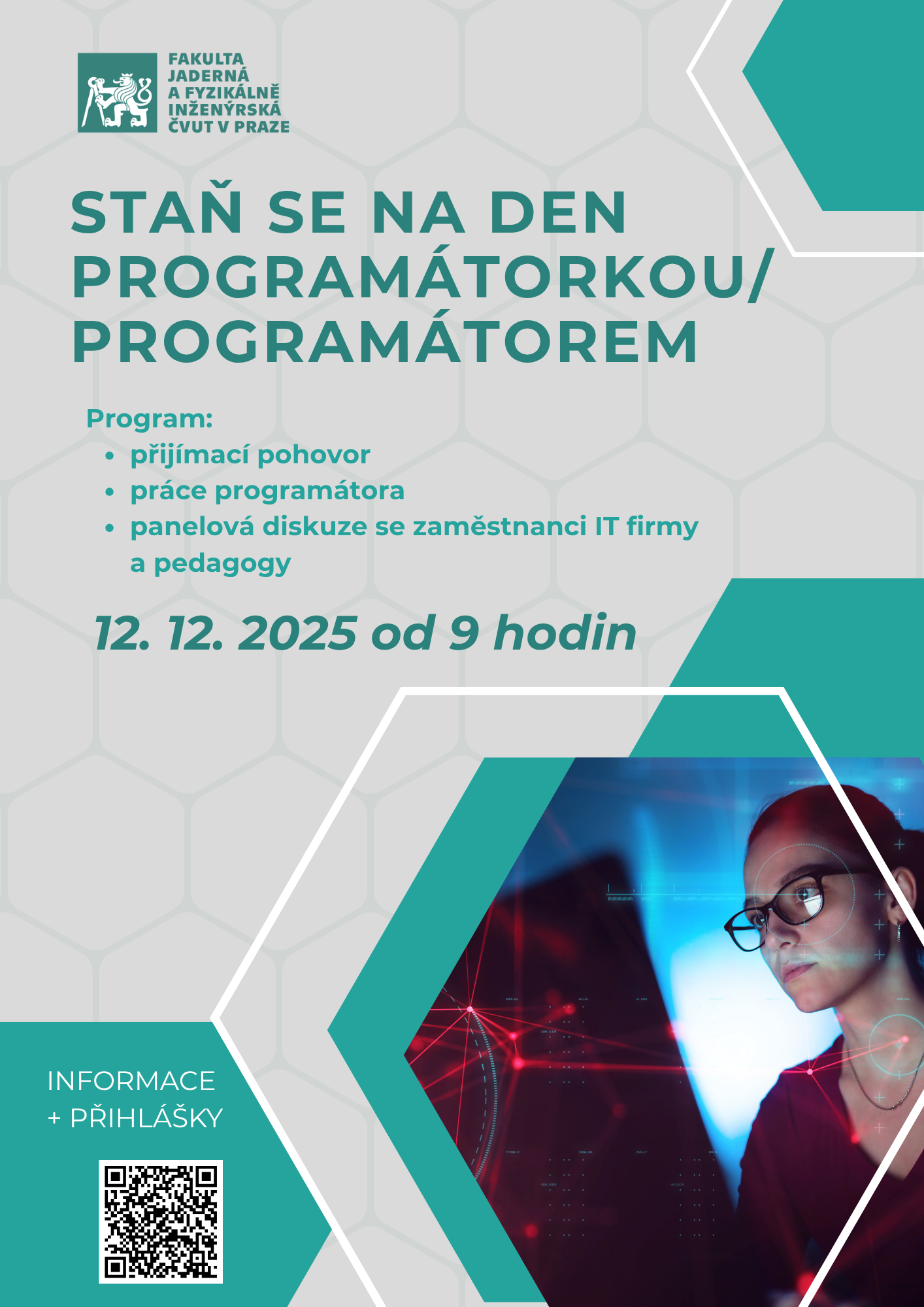 Představ si den, kdy se na okamžik ocitneš v roli profesionální programátorky, programátora! Studenti středních škol budou mít jedinečnou příležitost nahlédnout do fascinujícího světa programování na půdě Fakulty jaderné a fyzikálně inženýrské (FJFI) v Děčíně.